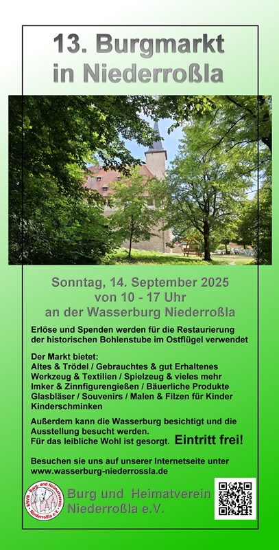 Auf Initiative Niederroßlaer Bürger kam eine neue Veranstaltung für die Gemeinde zustande: Ein Burgmarkt als Rahmenprogramm des alljährlichen Kreisdenkmaltages im Weimarer Land sollte Besucher in die Wasserburg locken und gleichzeitig Spenden aus Erlösen der Einnahmen erzielen. Angeboten wurde alles, was in Niederroßlaer Haushalten übrig war, außerdem Selbstgebautes oder Selbsterzeugtes. Das Konzept kam an und sorgte jedes Jahr für mehr Zuspruch aus Nah und Fern. Der Erlös des Marktes, nach Abzug der Selbstkosten, wurde für die Erneuerung von Fenster oder Türen in der Burg verwendet. Ab 2015 tritt der Burg- und Heimatverein selbst als Veranstalter des Burgmarkes auf.